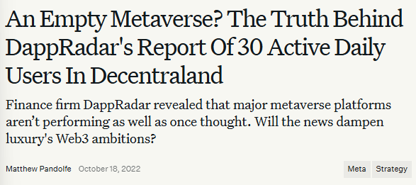 The euphoria behind the Metaverse led to a huge wave of speculative capital flooding in, long before the underlying idea, product, or asset class had proven itself (found PMF). We saw this with the astronomical increase in the prices of digital land in 2021–2022, even though the worlds themselves were boring and empty.