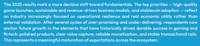 This points to a broader shift towards more speculative, risk-taking, and betting-like behavior (long degeneracy!). In this context, crypto gaming is aligned with this trend to become the “frontier of financialized entertainment”.