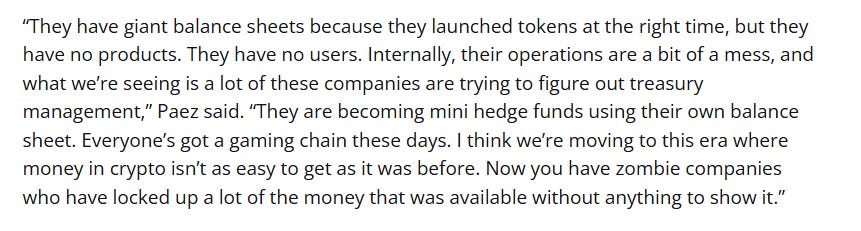 Companies like The Sandbox still have considerable treasuries, simply because they raised such enormous amounts of capital through venture, NFT, and token sales. Many of these projects are now operating more like mini hedge funds, trading off their own balance sheets rather than building games. Daniel Paez described them as “Zombie Companies”.