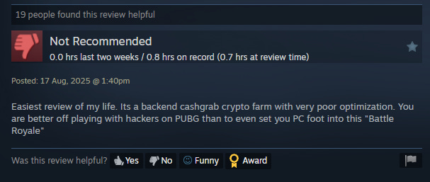 Furthermore, one can sense this negative connotation by reading through the reviews of the majority of Steam pages for crypto games. Even though the pages don’t mention the words “crypto” or “NFT”, players will often find out and center their review around its connection to blockchain. I would add that it is the worst with PC games built for Western audiences, as in the example of Off the Grid.
