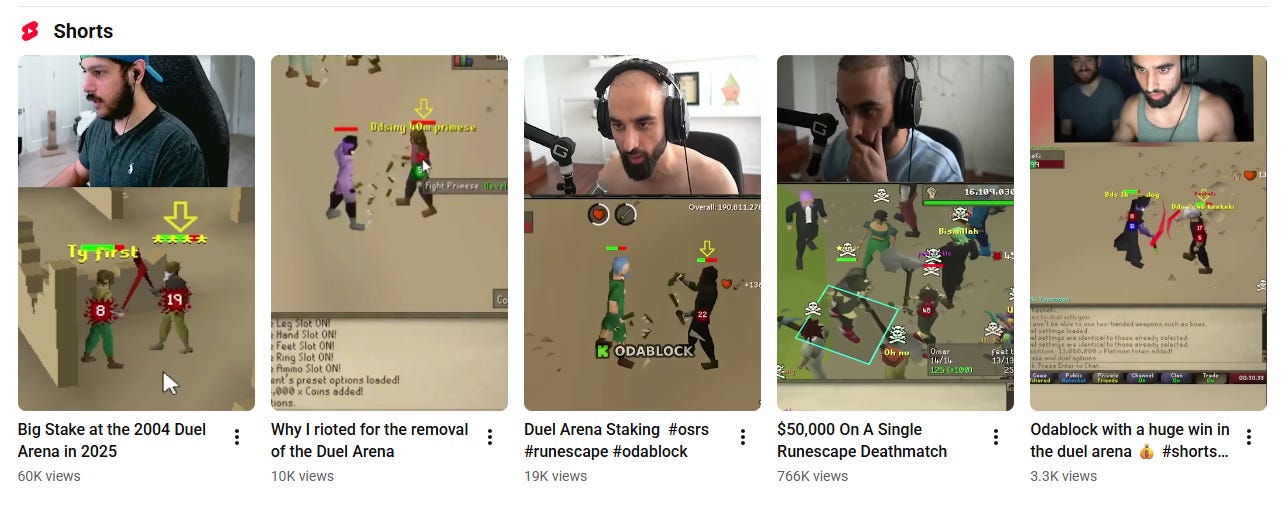 If I were to figure out a “consumer angle” for Cambria, for example, I would start by looking at formats and hooks used in performing YouTube Shorts of OSRS’s Duel Arena or in high-stakes PKing. Consumers aren’t familiar with terms like “Risk 2 Earn”, but they understand the gravity and thrill of risk and reward. Just look at the popularization of watching gambling and gacha (soft-gambling).