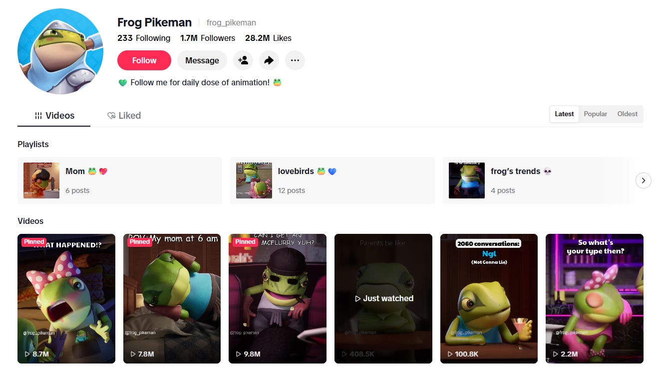 A glaring (and painful) example of this was AOF Verse’s TikTok strategy, which included building a library of short, relatable, and relevant videos centered around their character “Frog Pikeman”. This frog accrued millions of views, which led to millions of likes and followers.