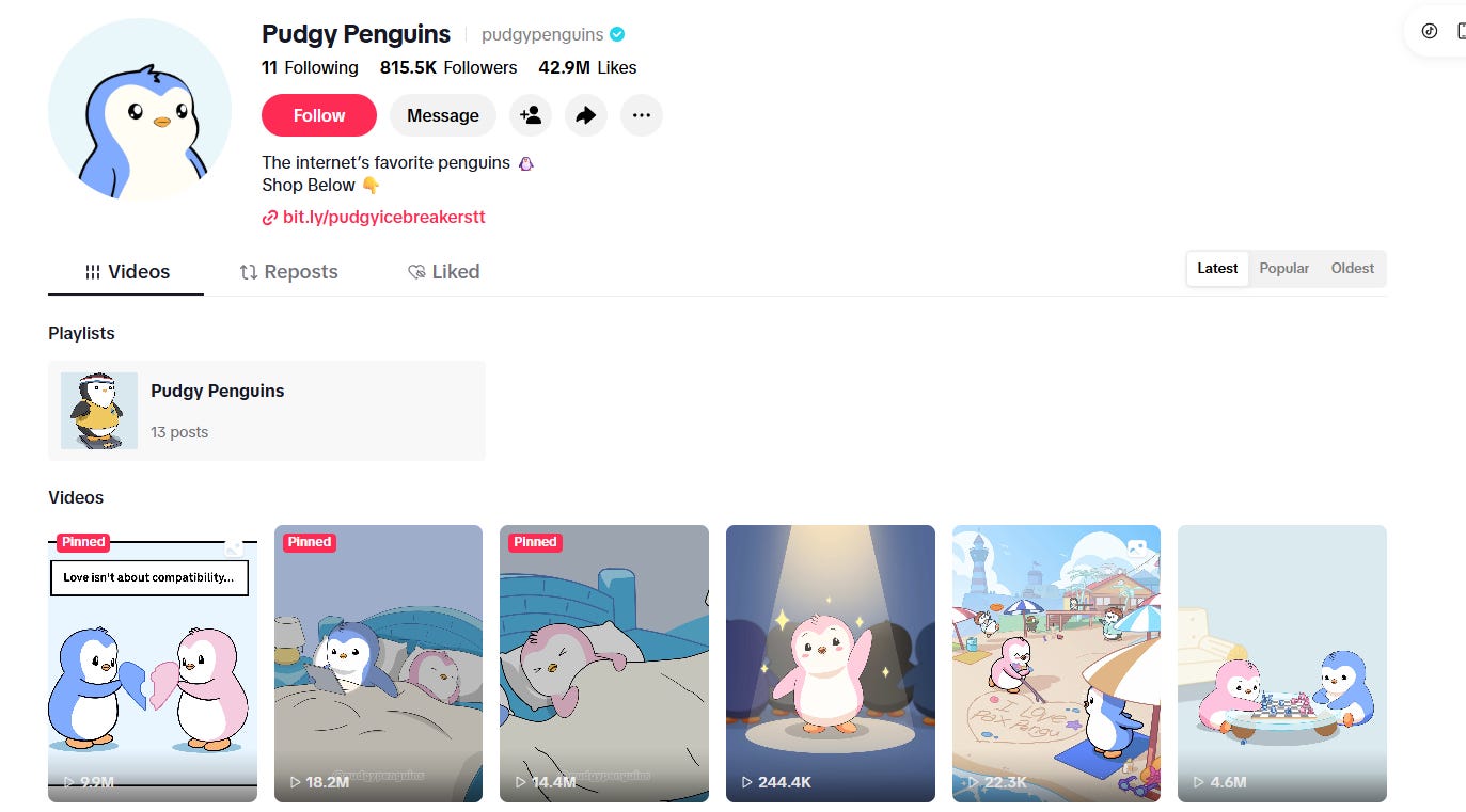 I want to add here that Pudgy’s page did start to advertise its products more on its page recently, but these are collectibles, merch, and board games. I.e. products that make much more sense to market towards an audience that’s a fan of your IP than a game is.